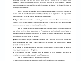 § 1º: No caso de o servidor possuir mais de um vínculo com a Prefeitura Municipal de Ernestina/RS e ou sua Autarquia, bem como a Câmara Municipal, de que trata esse Decreto, deverá realizar somente um recenseamento.