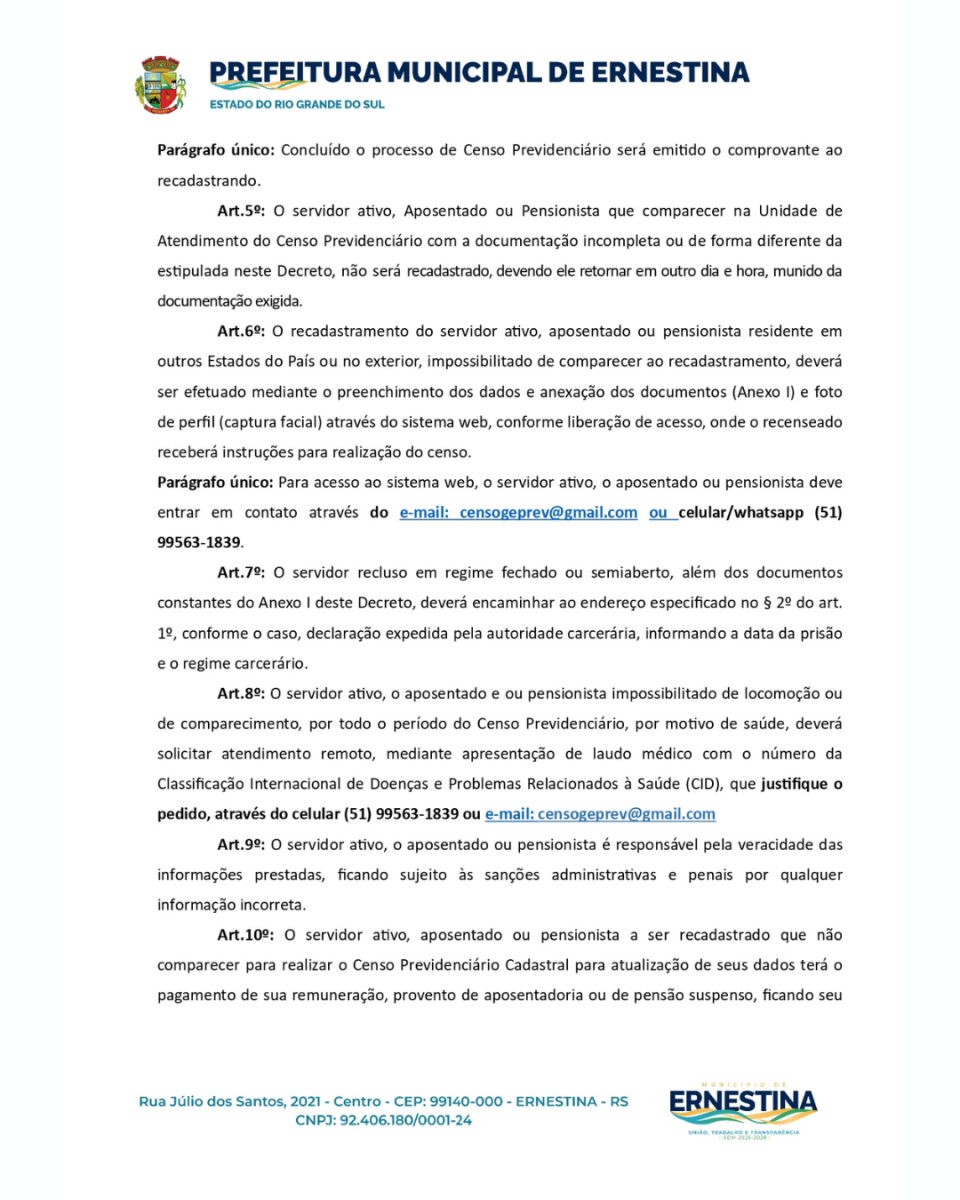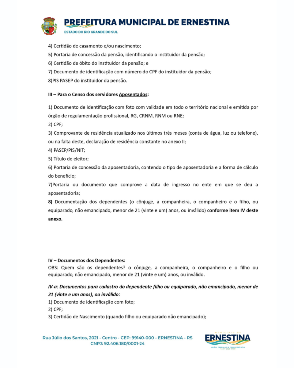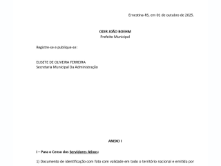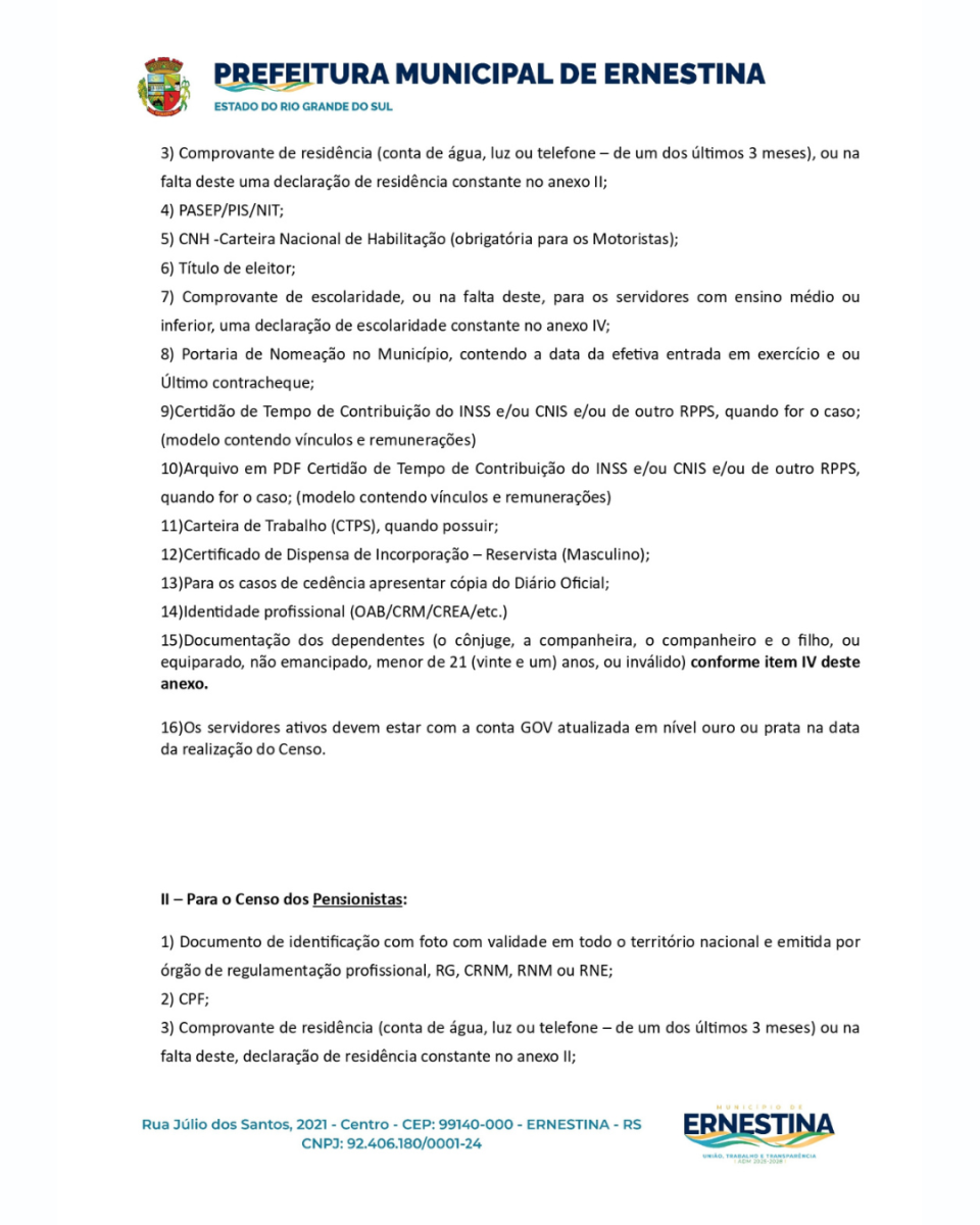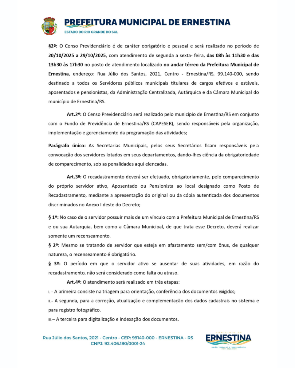 § 2º: O Censo Previdenciário é de caráter obrigatório e pessoal e será realizado no período de 20/10/2025 a 29/10/2025, com atendimento de segunda a sexta – feira, das 08h às 11h30 e das 13h30 às 17h30 no posto de atendimento localizado no andar térreo da Prefeitura Municipal de Ernestina, endereço: Rua Júlio dos Santos, 2021, Centro – Ernestina/RS, 99.140-000, sendo destinado a todos os Servidores públicos municipais titulares de cargos efetivos e estáveis, aposentados e pensionistas, da Administração Centralizada, Autárquica e da Câmara Municipal do município de Ernestina/RS.