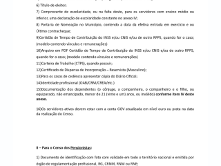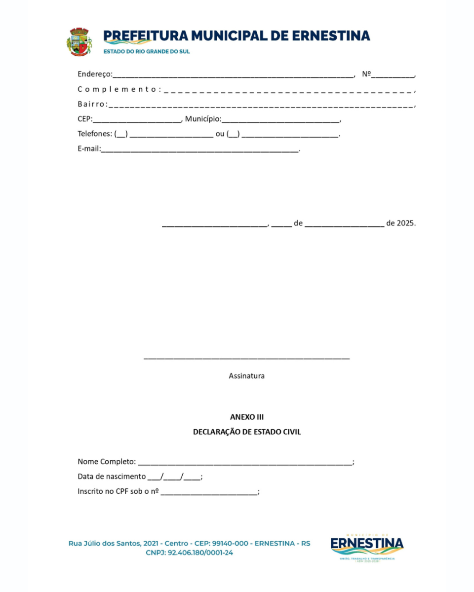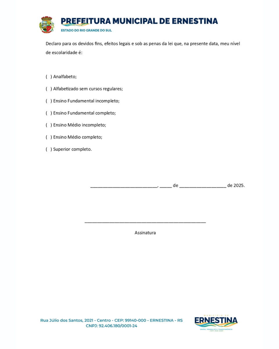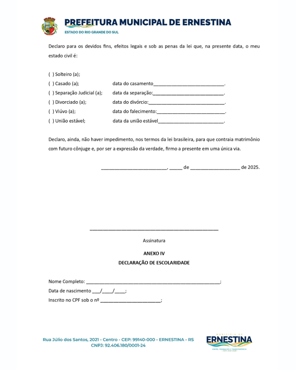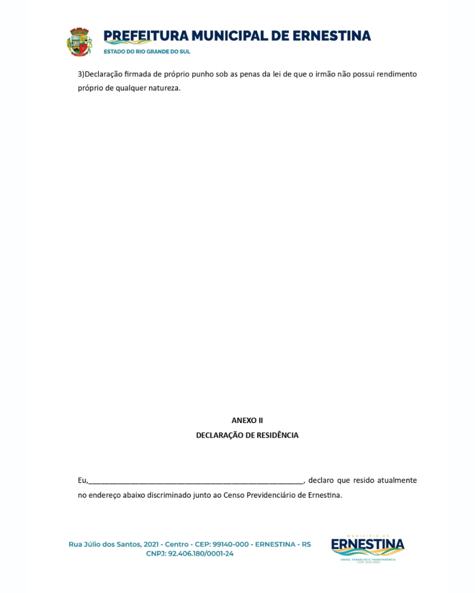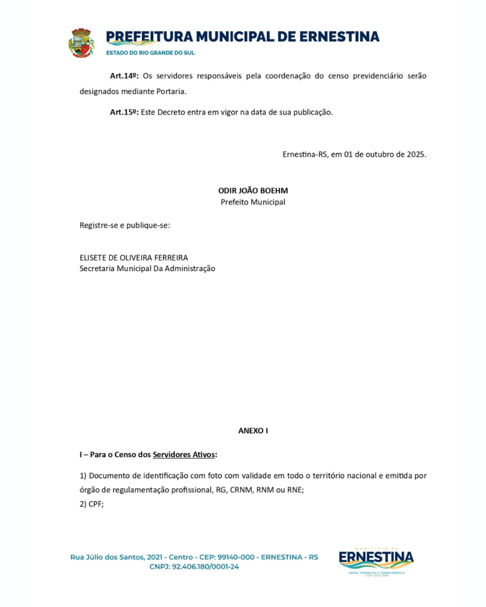 § 2º: O Censo Previdenciário é de caráter obrigatório e pessoal e será realizado no período de 20/10/2025 a 29/10/2025, com atendimento de segunda a sexta – feira, das 08h às 11h30 e das 13h30 às 17h30 no posto de atendimento localizado no andar térreo da Prefeitura Municipal de Ernestina, endereço: Rua Júlio dos Santos, 2021, Centro – Ernestina/RS, 99.140-000, sendo destinado a todos os Servidores públicos municipais titulares de cargos efetivos e estáveis, aposentados e pensionistas, da Administração Centralizada, Autárquica e da Câmara Municipal do município de Ernestina/RS.