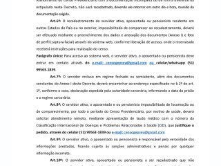 Art. 6º O recadastramento do servidor ativo, aposentado ou pensionista residente em outros Estados do País ou no exterior, impossibilitado de comparecer ao recadastramento, deverá ser efetuado mediante o preenchimento dos dados e anexação dos documentos (Anexo I) e foto de perfil (captura facial) através do sistema web, conforme liberação de acesso, onde o recenseado receberá instruções para realização do censo.