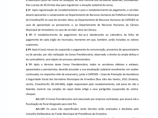 § 2º: Após regularização do recadastramento e para o restabelecimento do pagamento, o servidor deverá apresentar o comprovante ao Departamento de Recursos Humanos da Prefeitura Municipal de Ernestina/RS no caso de servidor ativo; ao Departamento de Recursos Humanos da CAPESER no caso de aposentado ou pensionista; e, ao Departamento de Recursos Humanos da Câmara Municipal de Vereadores no caso de servidor ativo da Câmara.