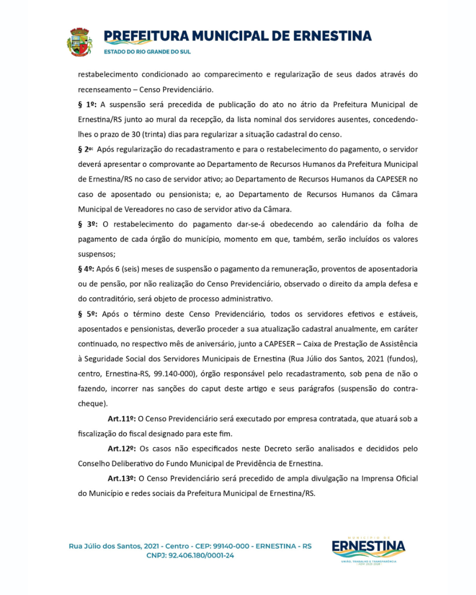 § 5º: Após o término deste Censo Previdenciário, todos os servidores efetivos e estáveis, aposentados e pensionistas, deverão proceder a sua atualização cadastral anualmente, em caráter continuado, no respectivo mês de aniversário, junto a CAPESER – Caixa de Prestação de Assistência à Seguridade Social dos Servidores Municipais de Ernestina (Rua Júlio dos Santos, 2021 (fundos), centro, Ernestina-RS, 99.140-000), órgão responsável pelo recadastramento, sob pena de não o fazendo, incorrer nas sanções do caput deste artigo e seus parágrafos (suspensão do contra-cheque).