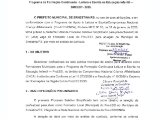 O PREFEITO MUNICIPAL DE ERNESTINA/RS, no uso de suas atribuições, e em conformidade com o Programa de Apoio à Leitura e Escrita/Compromisso Nacional Criança Alfabetizada (Pro-LEEI/CNCA), Portaria MEC Nº 85, de 31 de janeiro de 2025, torna público o presente Edital de Processo Seletivo Simplificado para preenchimento de 01 (uma) vaga de Formador Local do Pro-LEEI, para atuação no Município de Ernestina/RS, por meio de análise de currículo.