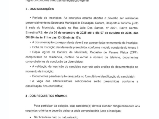 Período de Inscrições: 30/09/2025 a 07/10/2025 (Secretaria Municipal de Educação, Cultura, Desporto e Turismo).