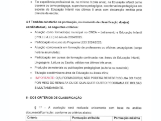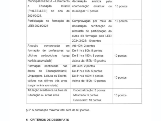 (Mais adiante o edital aponta critérios complementares de pontuação, tempo de experiência, titulação, etc. — ver itens específicos para critérios complementares.)