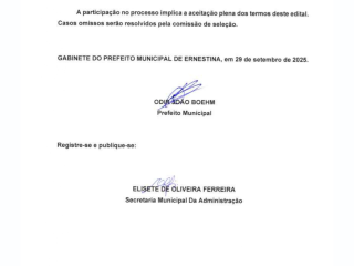 Período de Inscrições: As inscrições estarão abertas e deverão ser realizadas presencialmente na Secretaria Municipal de Educação, Cultura, Desporto e Turismo, junto à sede do Município, situado na Rua Júlio Dos Santos, nº 2021, Bairro Centro, Ernestina/RS, do dia 30 de setembro de 2025 até o dia 07 de outubro de 2025, das 08h30min às 11h e das 13h30min às 17h;