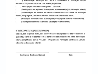 Selecionar profissionais da rede pública municipal de ensino para atuarem como Formadores Municipais para o Programa de Formação Continuada Leitura e Escrita na Educação Infantil — ProLEEI, no âmbito do Compromisso Nacional Criança Alfabetizada (CNCA), instituído pela Lei 11.273/2006 e a Resolução nº 10/2025 e Caderno de Orientações da Região Sul do ProLEEI 25/25.