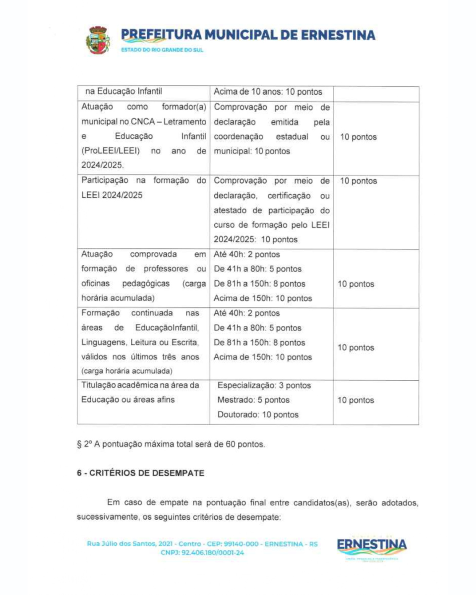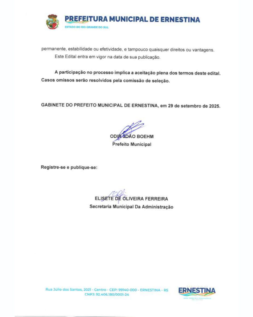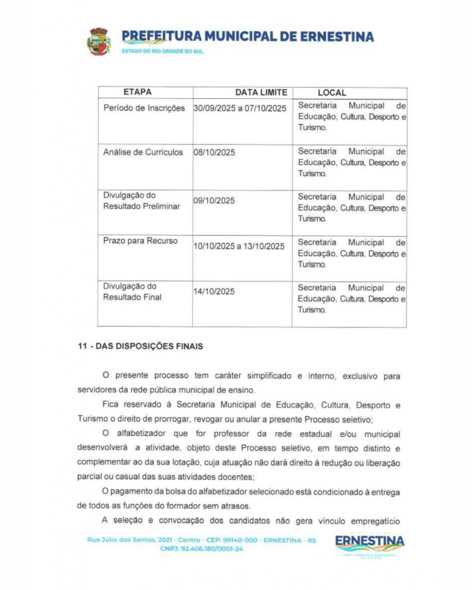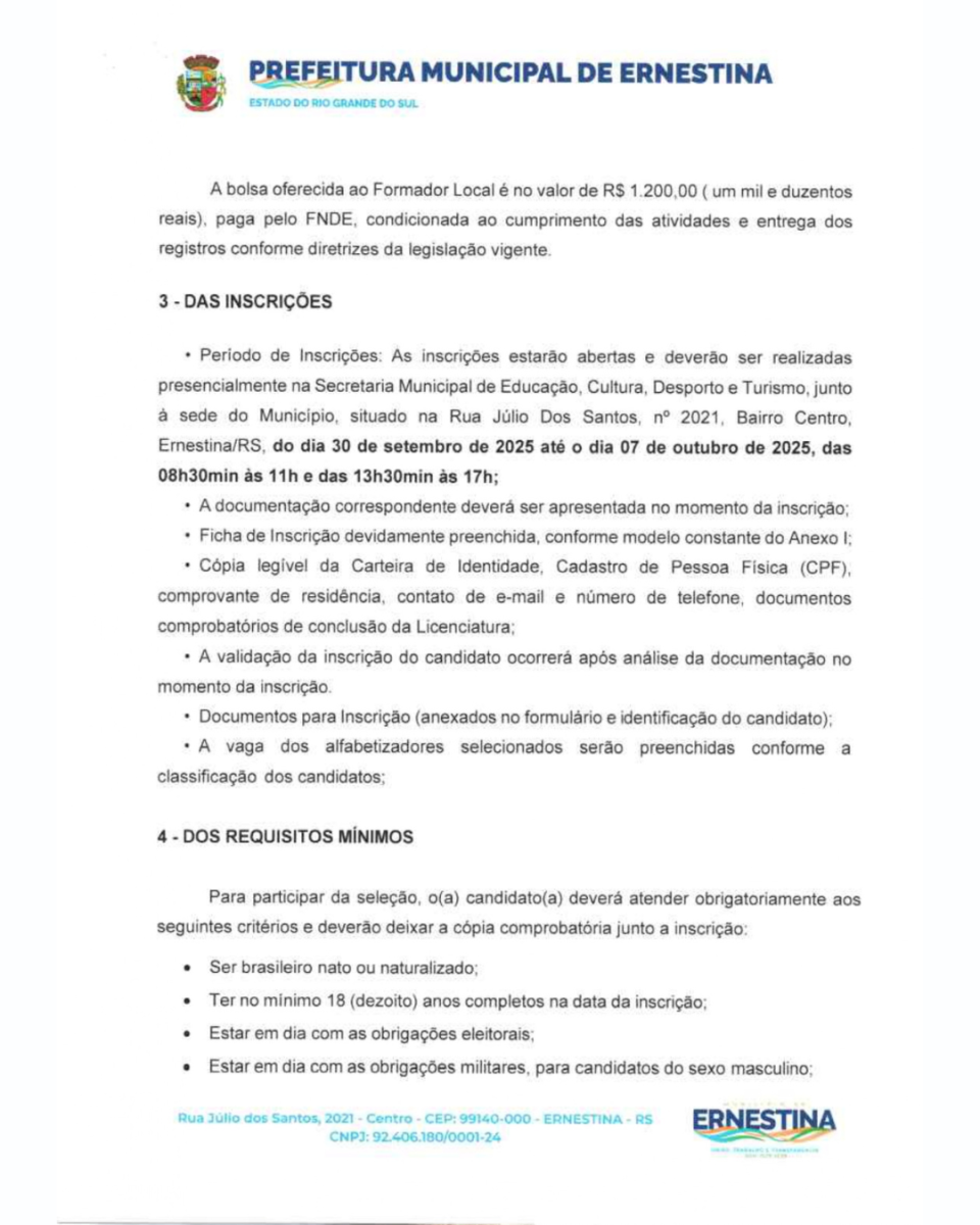 Período de Inscrições: As inscrições estarão abertas e deverão ser realizadas presencialmente na Secretaria Municipal de Educação, Cultura, Desporto e Turismo, junto à sede do Município, situado na Rua Júlio Dos Santos, nº 2021, Bairro Centro, Ernestina/RS, do dia 30 de setembro de 2025 até o dia 07 de outubro de 2025, das 08h30min às 11h e das 13h30min às 17h;