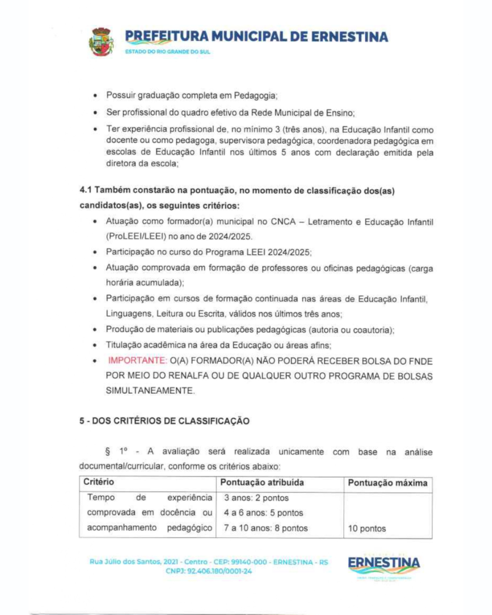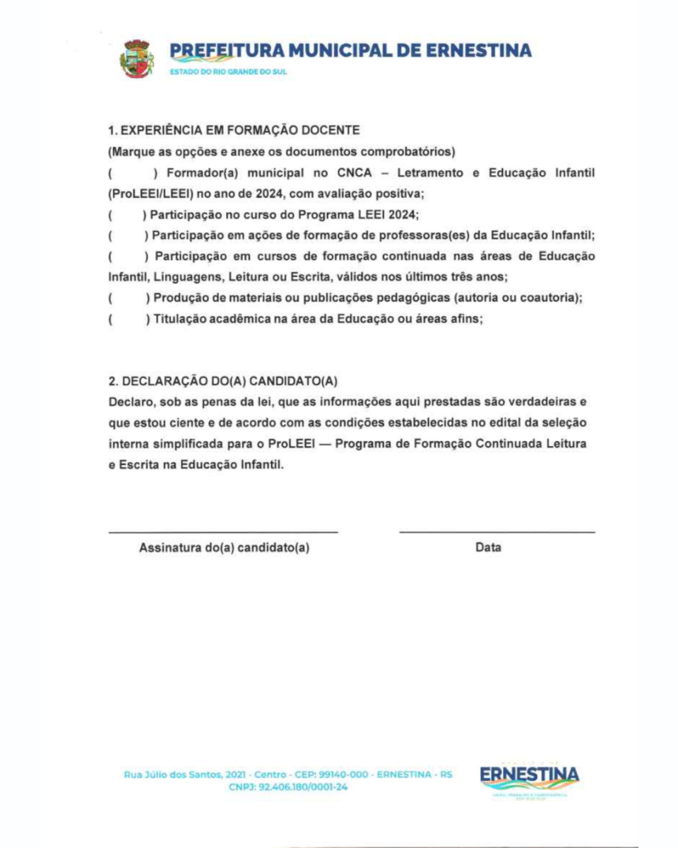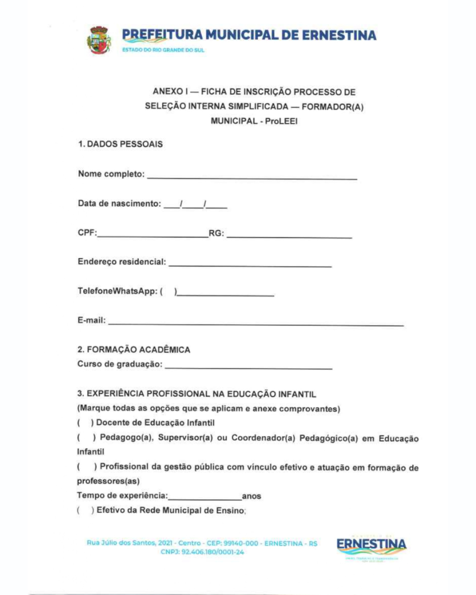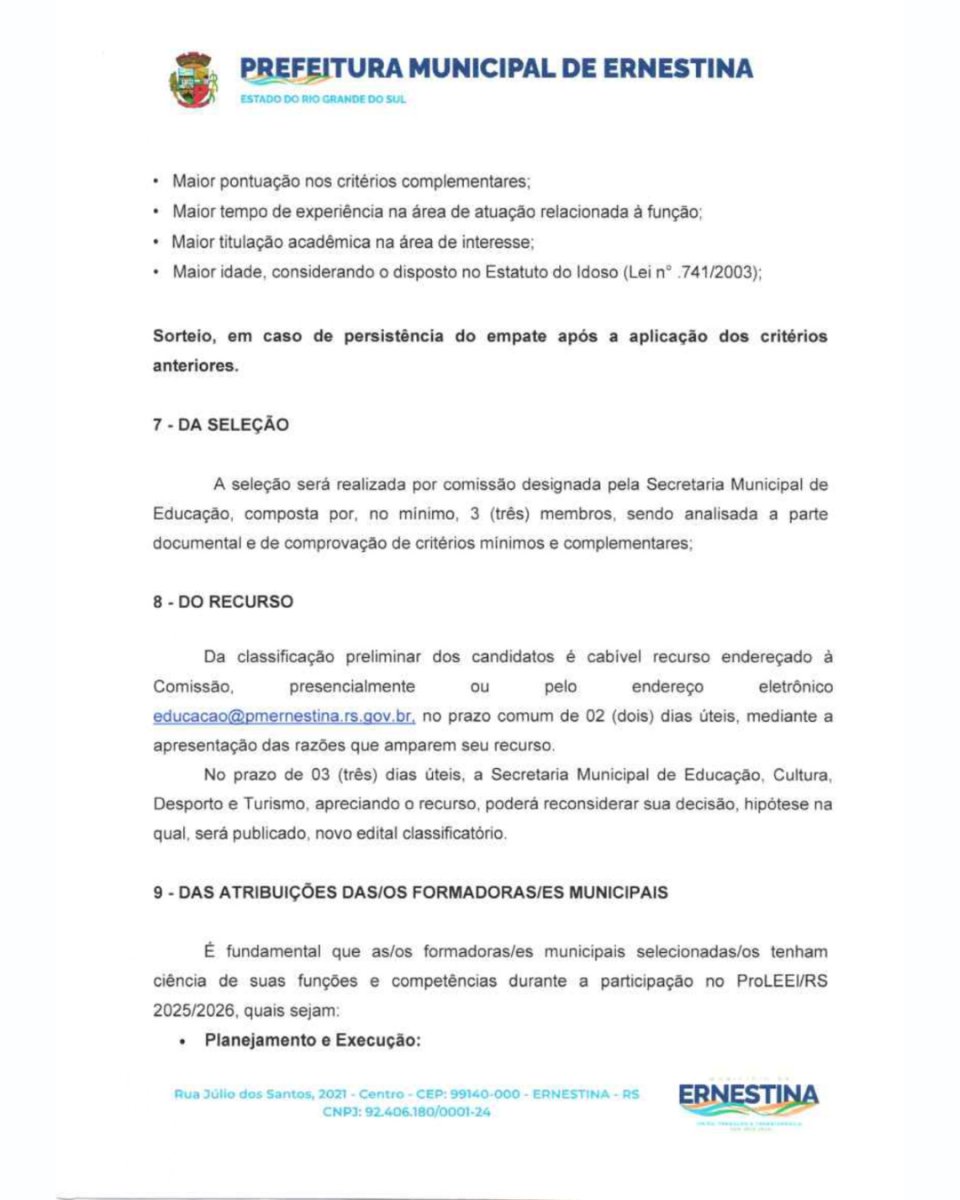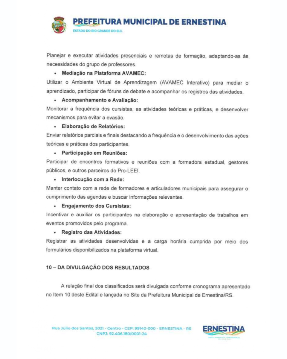 O presente Processo Seletivo Simplificado tem como objetivo a seleção de profissional para atuar como Formador Local (Municipal) do Pro-LEEI no Município de Ernestina/RS, integrando a Rede Nacional de Formadores do Pro-LEEI/CNCA.