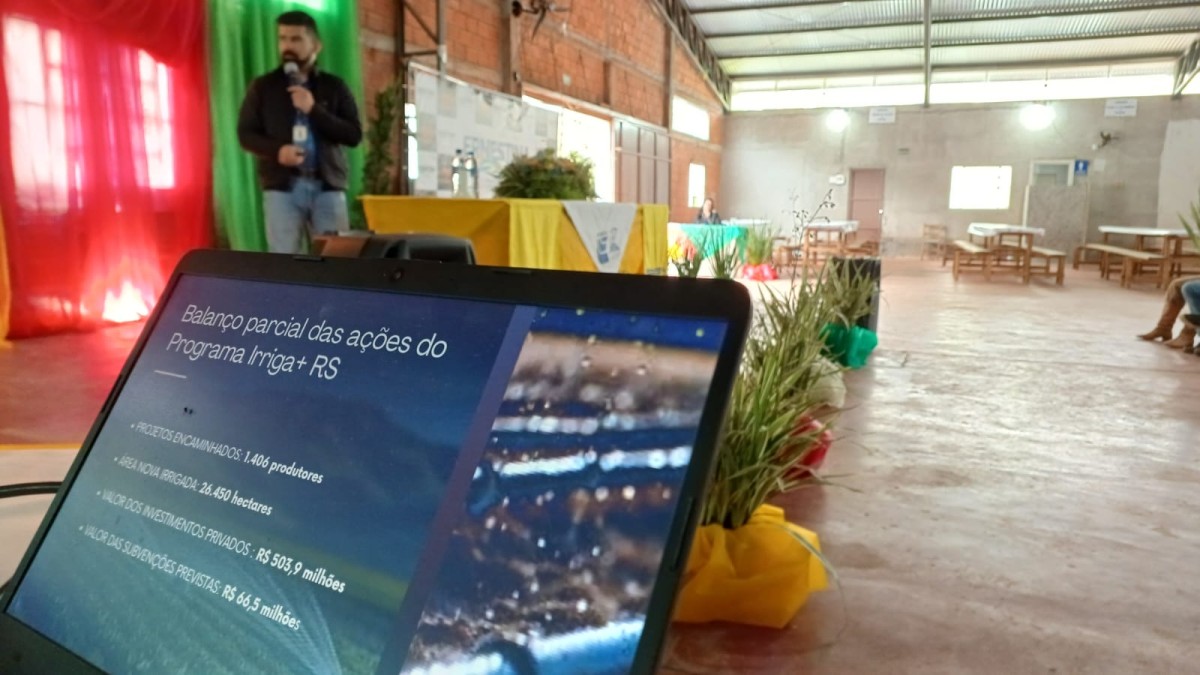 Promovido pela Emater/RS-Ascar e pela Secretaria Estadual da Agricultura, com apoio da Secretaria Municipal da Agricultura e Meio Ambiente de Ernestina, o Seminário Irriga+ RS foi realizado na tarde desta terça-feira (07/10), na comunidade de Três Lagoas. O encontro reuniu autoridades estaduais e municipais, produtores e técnicos, e evidenciou como o incentivo à irrigação tem gerado impactos positivos para a agricultura familiar e impulsionado a economia rural gaúcha.