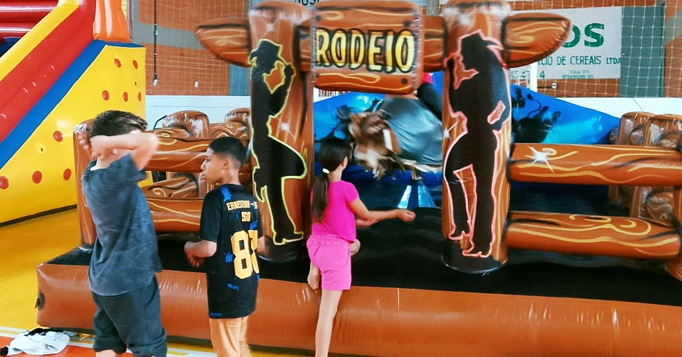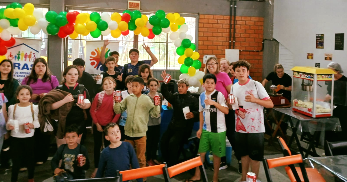 A atividade reuniu as crianças participantes das oficinas do Cras no Ginásio Municipal, em um momento para celebrar a infância, com brinquedos infláveis, pipoca, algodão doce e brincadeiras. A equipe da Secretaria de Assistência Social organizou o espaço, promovendo um ambiente acolhedor, de integração e valorização da infância.