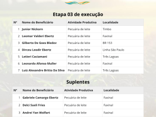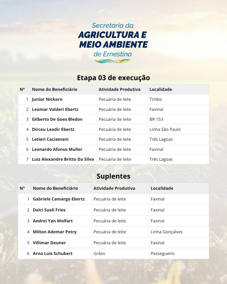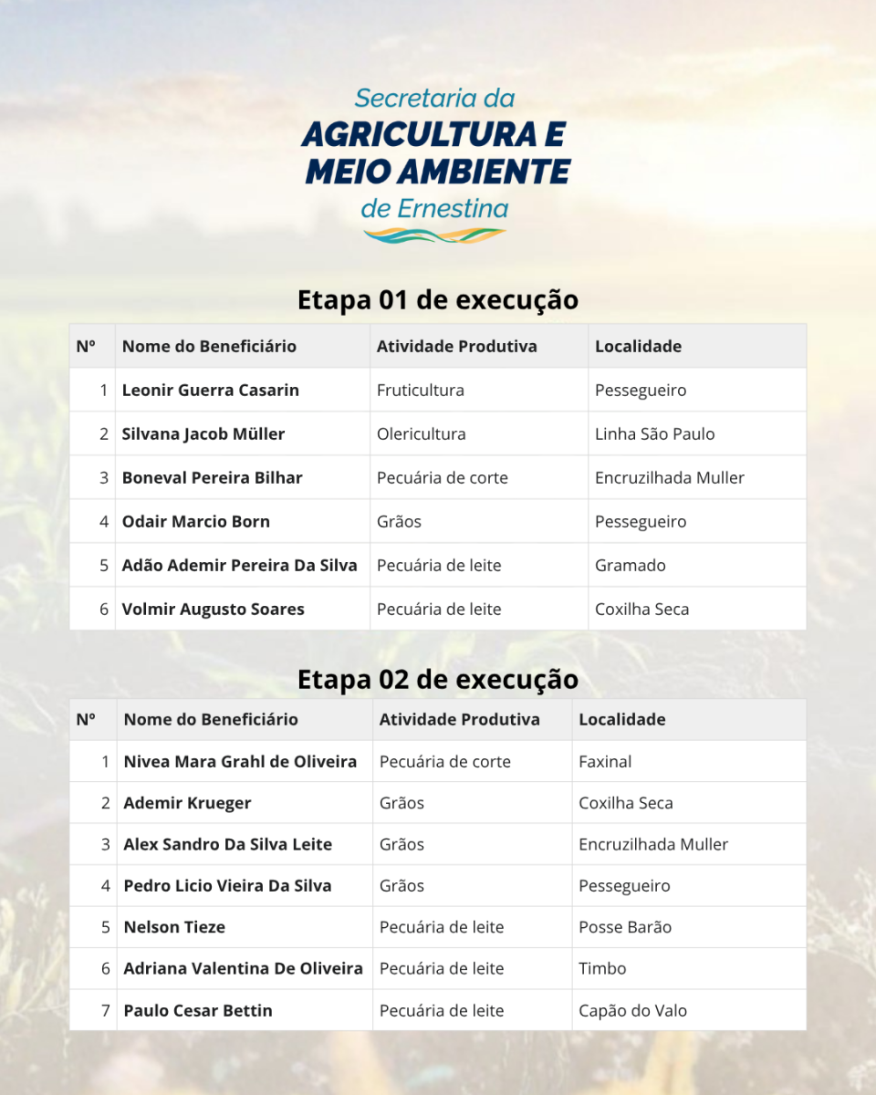- Confira a lista dos beneficiários, disponível também no site em: ernestina.rs.gov.br.