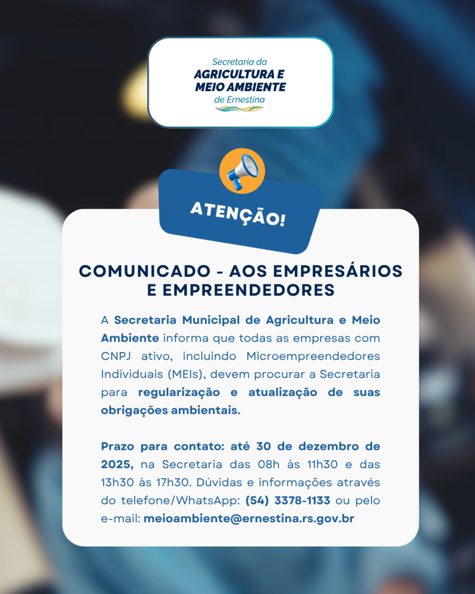 A Secretaria Municipal de Agricultura e Meio Ambiente informa que todas as empresas com CNPJ ativo, incluindo Microempreendedores Individuais (MEIs), devem procurar a Secretaria para regularização e atualização de suas obrigações ambientais. O objetivo é garantir que todas as atividades econômicas em funcionamento no município estejam em conformidade com a legislação ambiental vigente, contribuindo para o desenvolvimento sustentável, a preservação dos recursos naturais e a segurança jurídica de cada empreendedor.